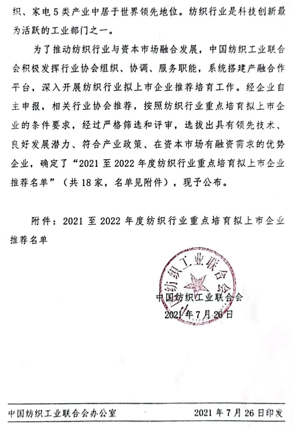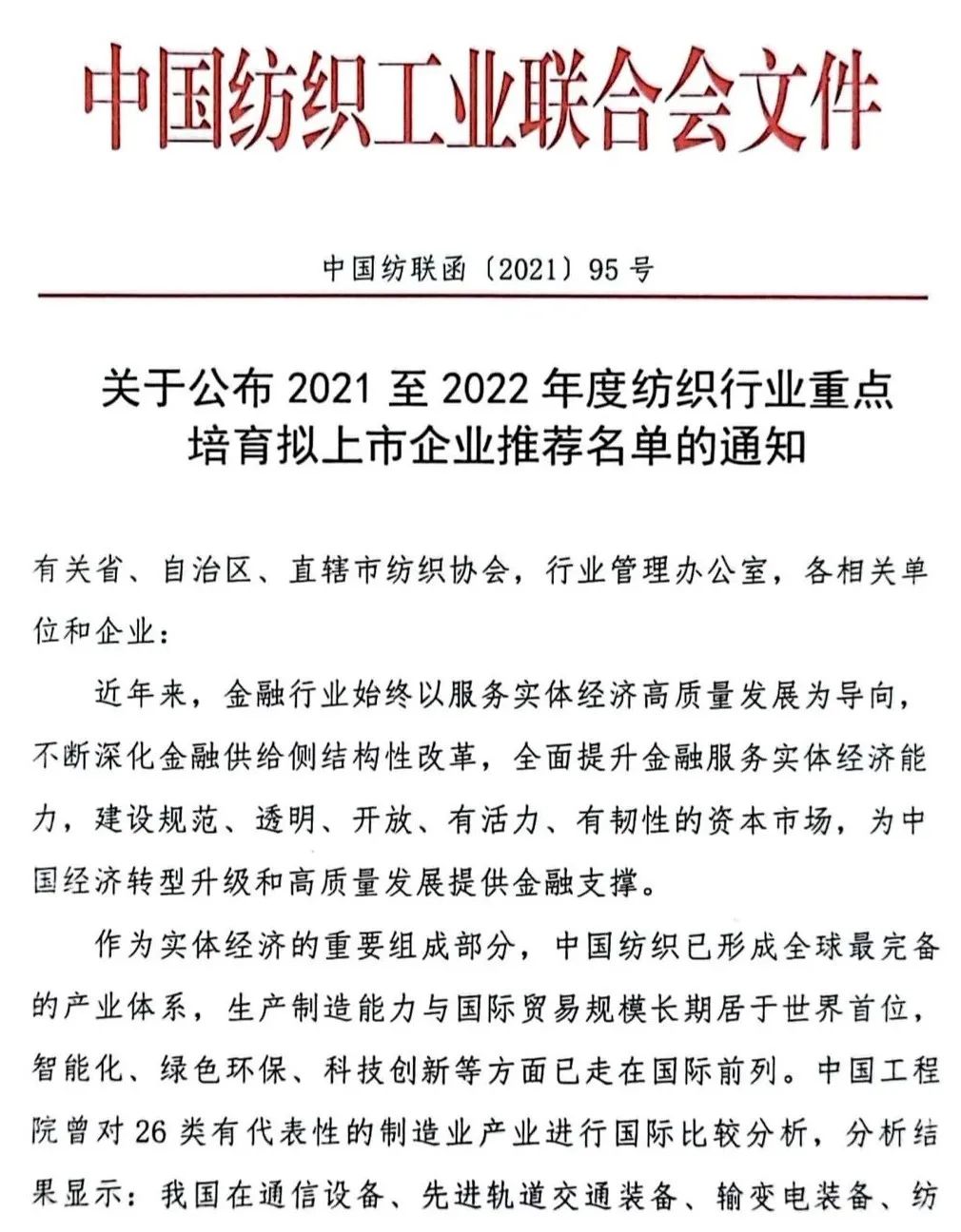W pierwszym roku 14. planu pięcioletniego Chińska Federacja Przemysłu Tekstylnego przyspiesza integrację przemysłu tekstylnego z rynkiem kapitałowym. W dniu 26 lipca Chińska Federacja Przemysłu Tekstylnego wydała zawiadomienie o opublikowaniu zalecanej listy kluczowych przedsiębiorstw, które mają zostać notowane w branży tekstylnej w latach 2021–2022. Po rygorystycznym sprawdzeniu i ocenie wyłoniono 18 korzystnych przedsiębiorstw dysponujących wiodącą technologią, dobrym potencjałem rozwojowym, zgodnie z politykami przemysłowymi i potrzebami finansowymi na rynku kapitałowym wybrano do stworzenia listy rekomendacyjnej. Przedsiębiorstwa te obejmują nowe materiały włókniste, inteligentną produkcję, konstruowanie mody, ekologiczną produkcję, wysokiej klasy tekstylia przemysłowe i inne dziedziny, które są również kluczowymi obszarami wspieranymi przez tekstylny „14. plan pięcioletni”.